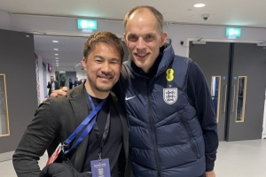 体育资讯4月3日讯 昨日,前日本国脚冈崎慎司更新社媒,晒出在温布利球场内和图赫尔的合影。