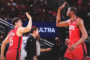 赛后火箭官方晒出本场赢球海报,杜兰特和谢泼德登上封面。