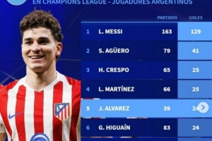 体育资讯4月9日讯 在欧冠淘汰赛首回合马竞2-0击败巴萨的比赛中,阿尔瓦雷斯破门。以下为欧冠历史阿根廷球员射手榜: