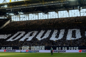 在对阵勒沃库森的比赛之前,多特南看台球迷展示TIFO,致敬已故的多特俱乐部工作人员达乌德·穆罕默德。